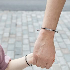 A stylish accessory designed for younger wrists, this bracelet combines black leather with stainless steel accents including an engravable bar—perfect for personalisation.