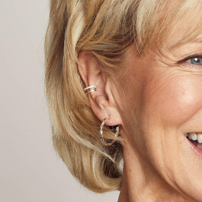 A contemporary twist on the classic hoop, these elegant earrings feature a subtle spiral design in lustrous recycled sterling silver, making them a refined addition for daily wear or effortless layering.